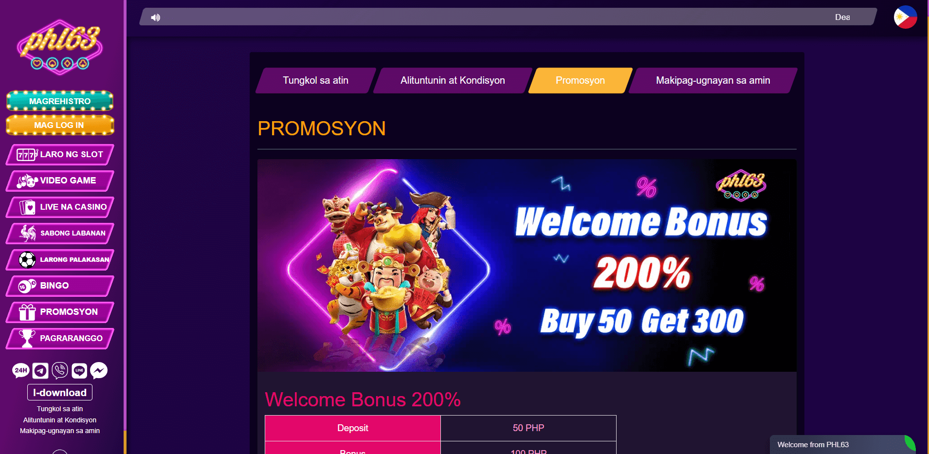 The listed phl63 welcome bonus is 200% up to 300 PHP. In practical terms, if you deposit 50 PHP, the 200% calculation is 50 x 2 = 100 PHP bonus, so your total playable balance becomes 150 PHP before any bonus terms are applied.